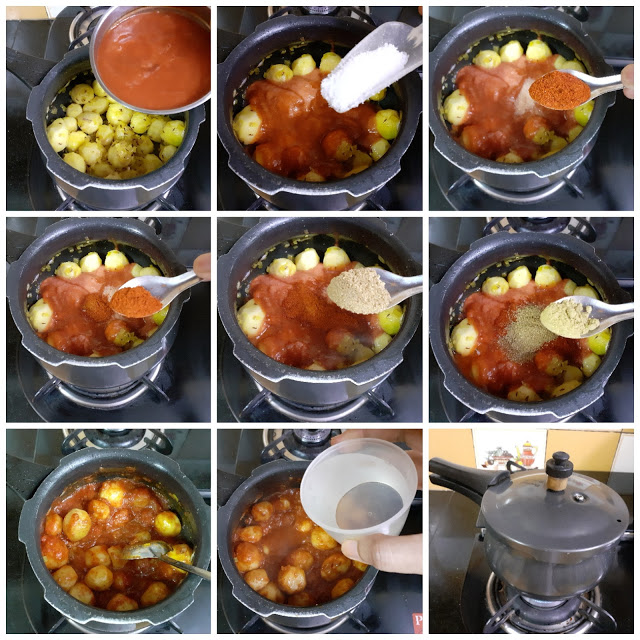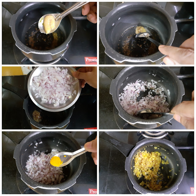 STEP 1 : Wash the rice for the Pulav, add adequate water, and pressure cook. (details in recipe). (15 mins approx to cook)
