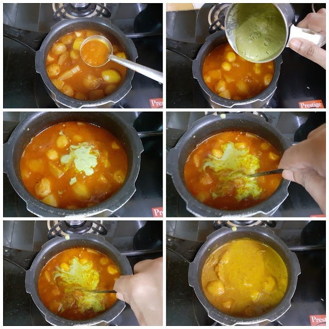 5. Put the onion and 1 green chilli into a blender and grind to a smooth paste. Remove the paste, and blend the tomato into a smooth puree. Now in the same wok heat the oil and drop in the onion paste. Fry nicely until light brown. Now add the tomato puree and mix well. Cook the onion tomato paste on high flame and start drying out the moisture.