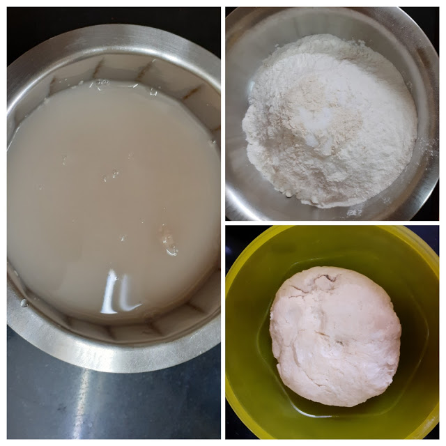 The dough for these Rotis is like the one made for Modak/kozhakattai. Having said this, it is important to make the dough well. I have cooked the Rotis with store bough rice flour, so some cracks towards the edge are seen. A smooth flour will ensure no cracks at all. The flour can also be made by pounding rice to a fine flour at home itself in a mixie.